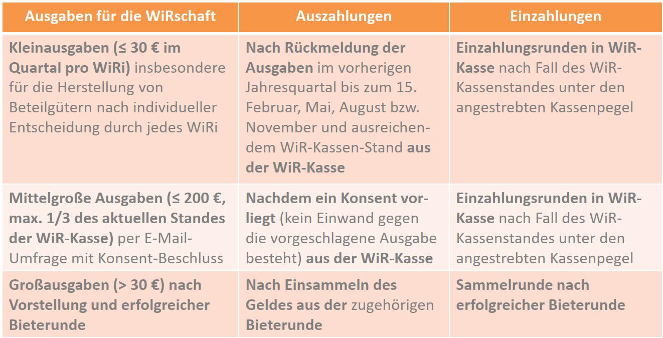 Aufgrund der Erfahrungen mit dem WiR-Ausgleich Q3-2022 wurde Ende März 2023 ein neuer Umgang mit den gemeinsamen Geldausgaben für die WiRschaft verabredet (siehe oben). Geldausgaben bis zu 30 € pro Jahresquartal und WiRi werden ab Q4-2022 direkt aus der WiR-Kasse ausgeglichen. Für Großausgaben über 200 € ist die Finanzierung nur noch über €-Bieterunden möglich. Ausgaben bis 200 €, wobei der Betrag ein Drittel des aktuellen Kassenstandes der WiR-Kasse nicht überschreiten darf, können ab Ende September 2025 (siehe 52. WiR-Online) per E-Mail-Umfrage im Konsent beschlossen werden.
